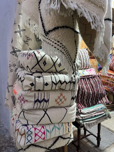 For me, the area of the old city and the Kasbah of the Udayas is a constant source of inspiration for me as a designer. The medina is a vibrant and artistic place where creativity is woven into every corner. The objects sold in the shops showcase an incredible variety of traditional craftsmanship, from hand-carved woodwork to intricate textiles and ceramics. But it’s not just the items on display; the architecture is so impressive. Ornamental details adorn the walls, doors and even the smallest nooks, with painted motifs and mosaics that tell stories of Moroccan artistry. Walking through, you’ll often see artisans at work, painting, sculpting or crafting new pieces, always open to sharing their process. It’s a place that reminds me of the richness of my culture and the beauty of handmade work, where art comes alive in every detail, offering with such variety that anyone is sure to find something that resonates.